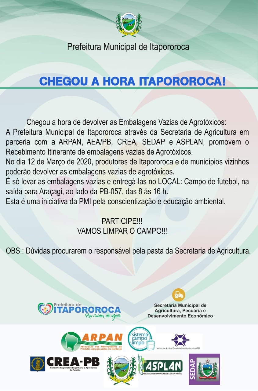 A Prefeitura de Itapororoca, através da Secretaria de Agricultura, em parceria com a Arpan, AEA/PB, CREA, SEDAP e ASPLAN, promoverá no próximo dia 12 de março o recebimento das embalagens vazias de agrotóxicos.