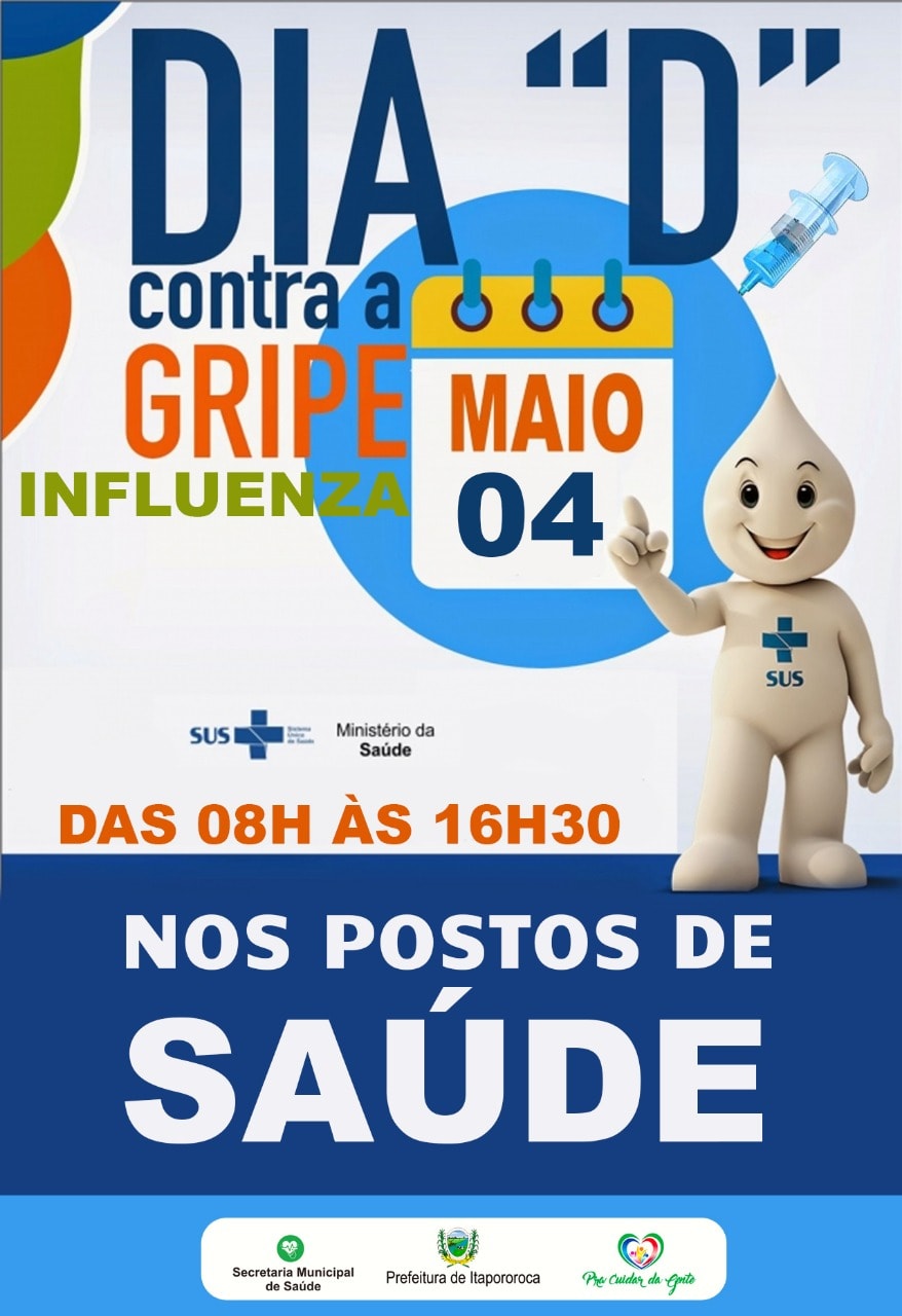 Desde o dia 10/04 até 31/05, todas as Unidades Básicas de Saúde (UBS) de Itapororoca-PB estão com salas de vacina abertas, segundo cronograma de cada unidade, para a realização da campanha contra Influenza. O Dia D da Campanha será neste sábado (04/05) em todas as UBSs do município.